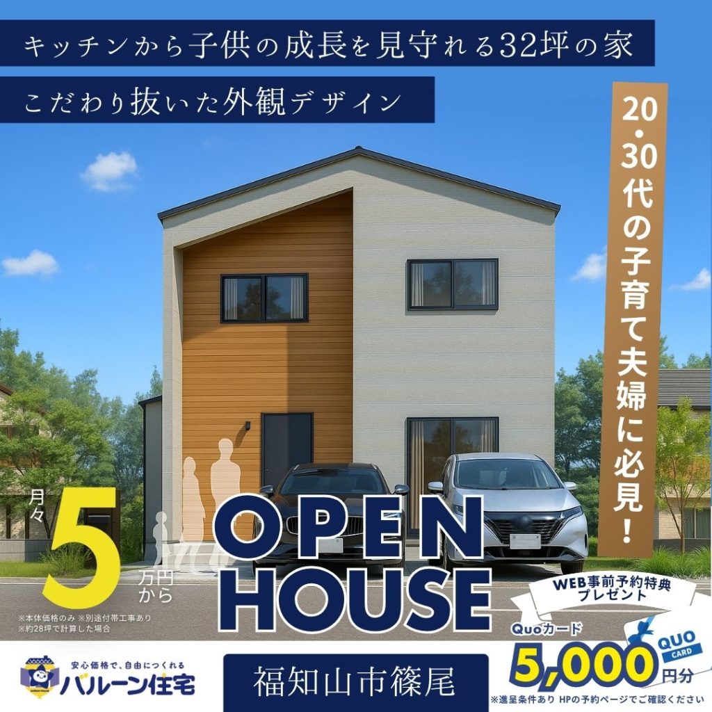 このたび、福知山市篠尾にて、新築一戸建ての完成見学会を開催します。20代・30代の子育て世代にぴったりの、暮らしやすさを追求した住まいを、ぜひこの機会にご覧ください。