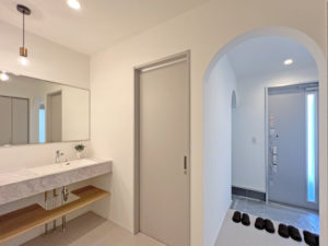・玄関を開けてすぐ目を引く、曲線が美しいRの垂れ壁