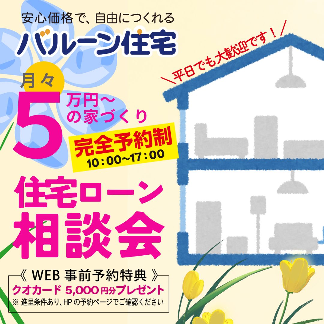「家は建てたいけど、ローンが通るか不安…」「そもそも月々いくら払えるのか、よくわからない…」そんなお悩みをお持ちの方のために、住宅ローン・資金計画の相談会を開催します!