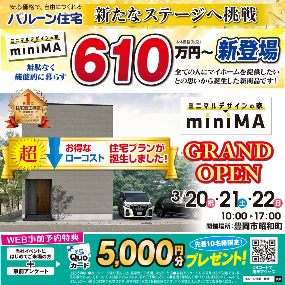 2026年3月20日(祝)・21日(土)・22日(日)の3日間、豊岡市昭和町にて「miniMA グランドオープン見学会」 を開催します! 豊岡市のモデルハウスに「miniMA(ミニマルデザインの家)」新登場です! すべての人にマイホームを提供したいとの思いから誕生した新商品です!